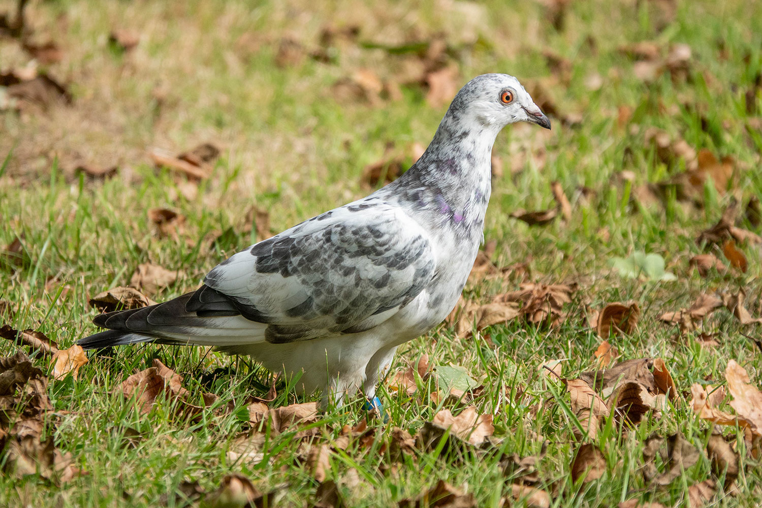 Feral Pigeons are the ones you will see in and around town centres. They can have all sorts of colour variations, including areas of brown, or an overall dark grey colour.They are descendants of the Rock Dove, but you will only see wild Rock Doves in the north west of Scotland and Ireland. This one is a particularly manky one, and as it is ringed it may well once have been a racing pigeon. The eye is different to both stock doves and wood pigeons - feral pigeons have orange eyes.