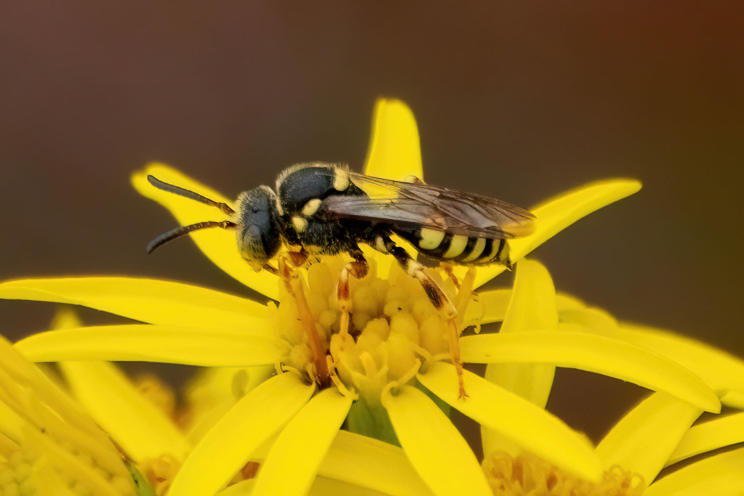 The Nomad Bee is a family of bees, many of which have wasp-like markings. There are hundreds of species in this family, but only 34 are known in the UK. This one is possibly a Black-horned Nomad Bee. They are about 1cm long and usually fly in July to September.
