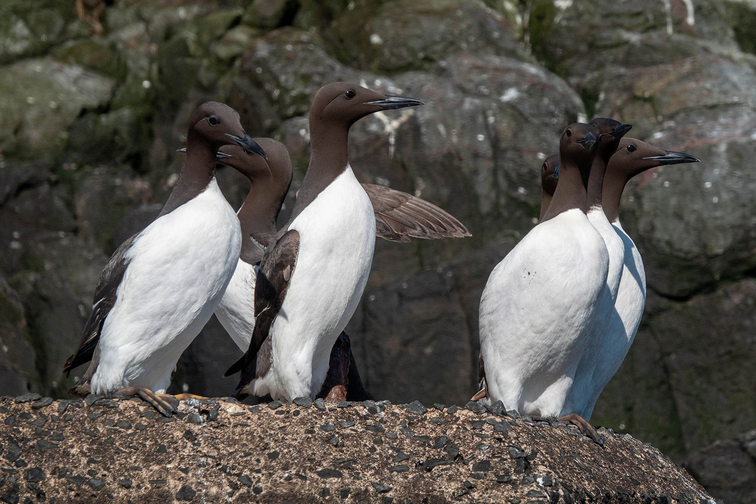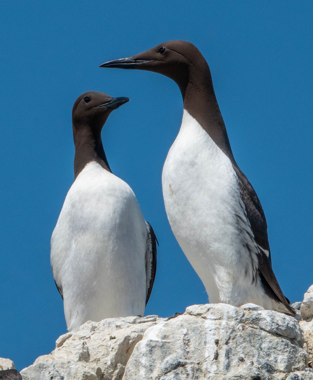 Guillemots breed on the coast huddled together on Rocky cliffs. These are in summer plumage, with very neat lines. Unlike Razorbills which are black and white, Guillemots tend to be more chocolate brown and white. When you see them fly past they fly quite low and fast with quite a rapid wingbeat, often in small flocks.