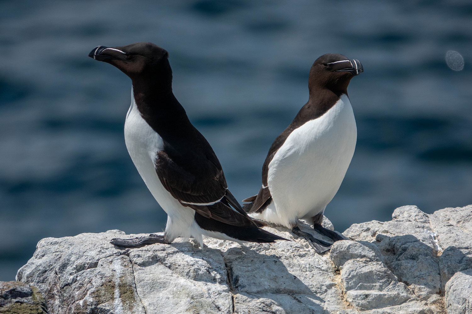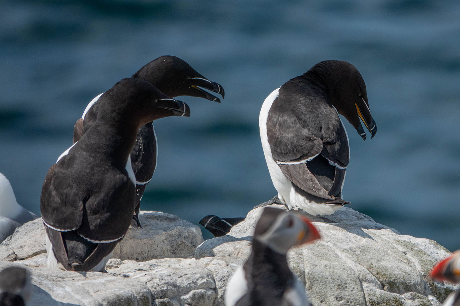 Razorbills breed on rocky cliffs. These are in summer plumage with clean lines and sharp markings. Easy to distinguish from a guillemot, as it has a broad, less pointed bill, with clear white lines running down it. Notice the bright yellow gape.